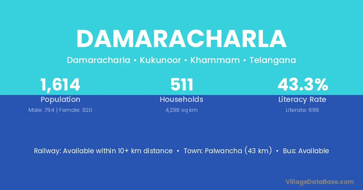 Palwancha (43 km) is the nearest town to Damaracharla village for major economic activities and is located approximately 43 km away.