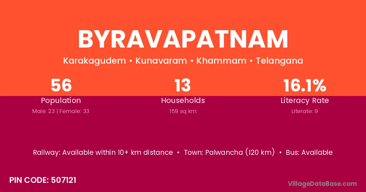 Palwancha (120 km) is the nearest town to Byravapatnam village for major economic activities and is located approximately 120 km away.