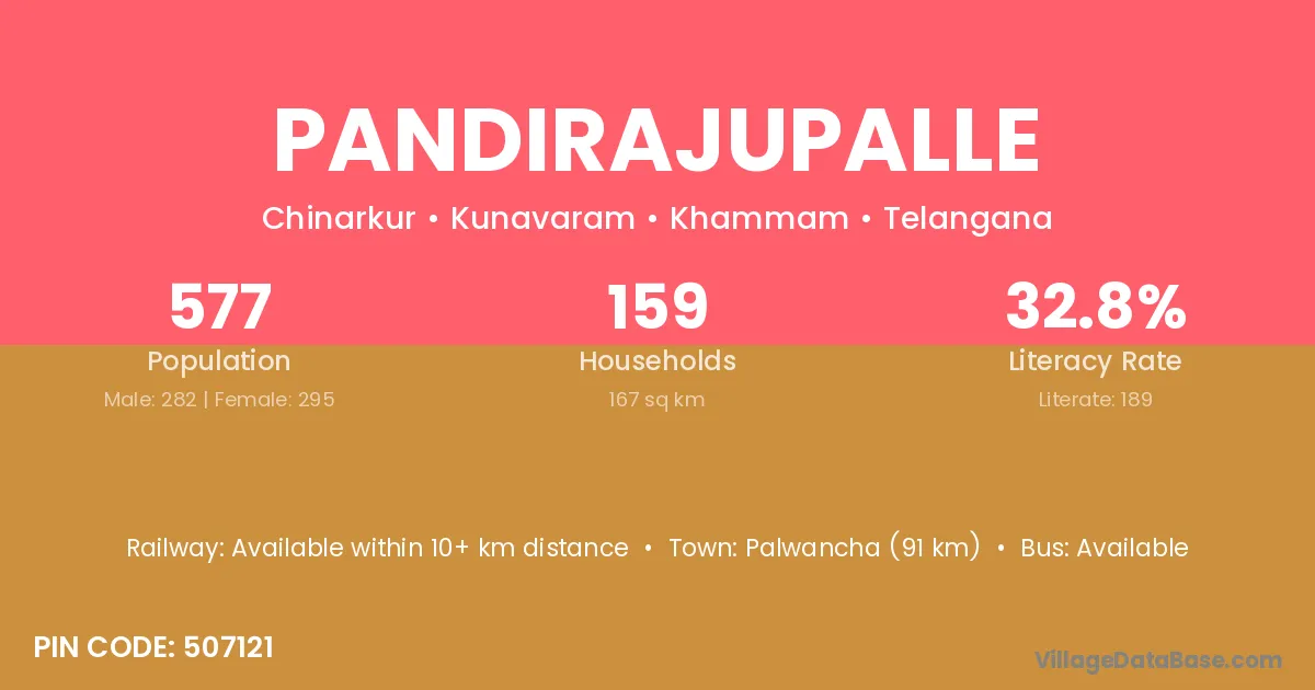 Palwancha (91 km) is the nearest town to Pandirajupalle village for major economic activities and is located approximately 91 km away.