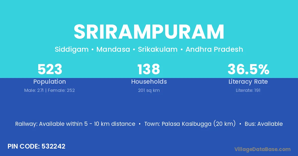 The literacy rate of Srirampuram village is 28.69%. Male literacy stands at 38.00% and female literacy at 22.22%.