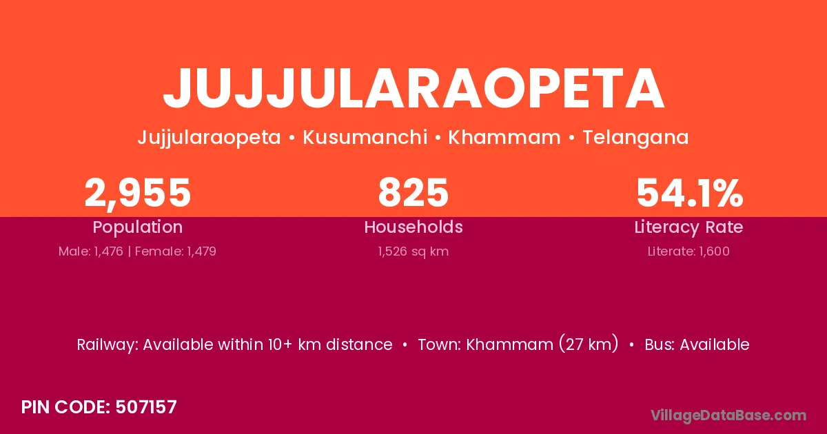 Khammam (27 km) is the nearest town to Jujjularaopeta village for major economic activities and is located approximately 27 km away.