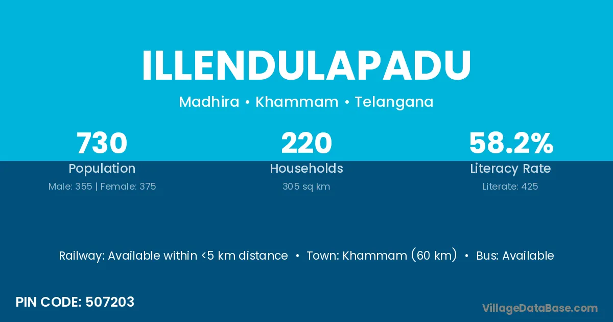 Khammam (60 km) is the nearest town to Illendulapadu village for major economic activities and is located approximately 60 km away.