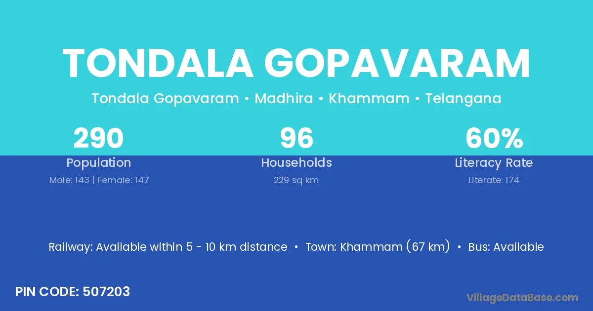 Khammam (67 km) is the nearest town to Tondala Gopavaram village for major economic activities and is located approximately 67 km away.
