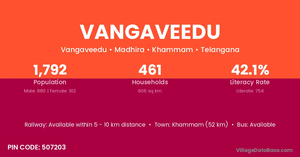 Khammam (52 km) is the nearest town to Vangaveedu village for major economic activities and is located approximately 52 km away.