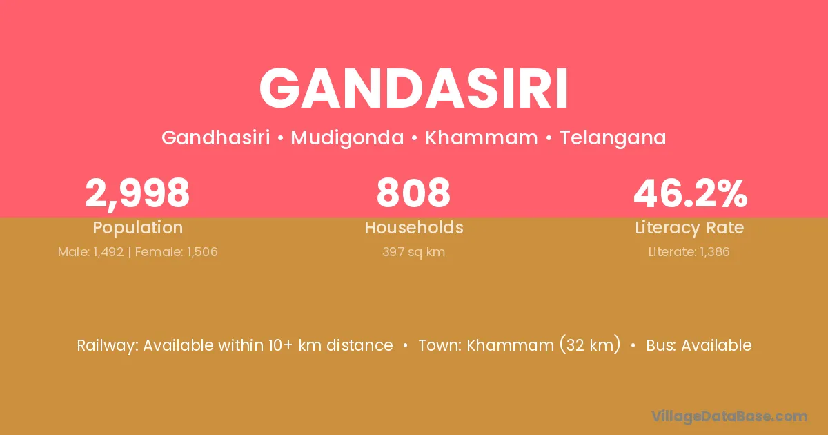 Khammam (32 km) is the nearest town to Gandasiri village for major economic activities and is located approximately 32 km away.