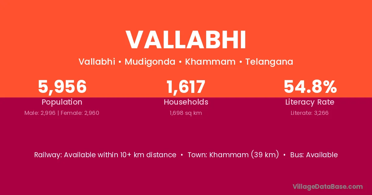 Khammam (39 km) is the nearest town to Vallabhi village for major economic activities and is located approximately 39 km away.