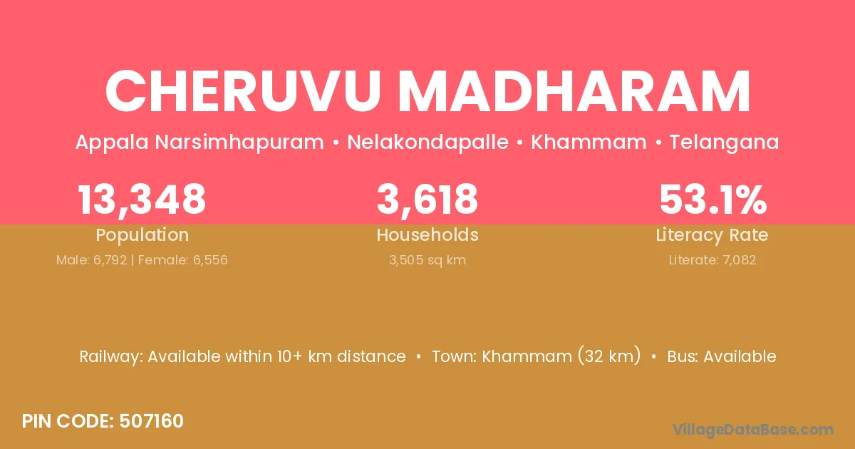 Khammam (32 km) is the nearest town to Cheruvu Madharam village for major economic activities and is located approximately 32 km away.