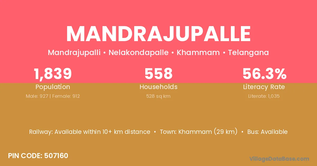 Khammam (29 km) is the nearest town to Mandrajupalle village for major economic activities and is located approximately 29 km away.