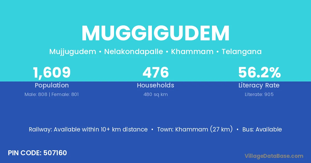 Khammam (27 km) is the nearest town to Muggigudem village for major economic activities and is located approximately 27 km away.