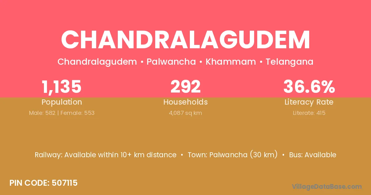Palwancha (30 km) is the nearest town to Chandralagudem village for major economic activities and is located approximately 30 km away.