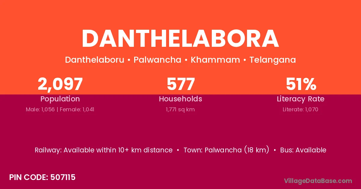 Palwancha (18 km) is the nearest town to Danthelabora village for major economic activities and is located approximately 18 km away.