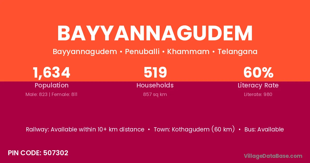 Kothagudem (60 km) is the nearest town to Bayyannagudem village for major economic activities and is located approximately 60 km away.