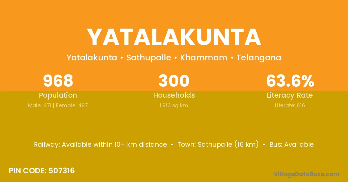 Sathupalle (16 km) is the nearest town to Yatalakunta village for major economic activities and is located approximately 16 km away.