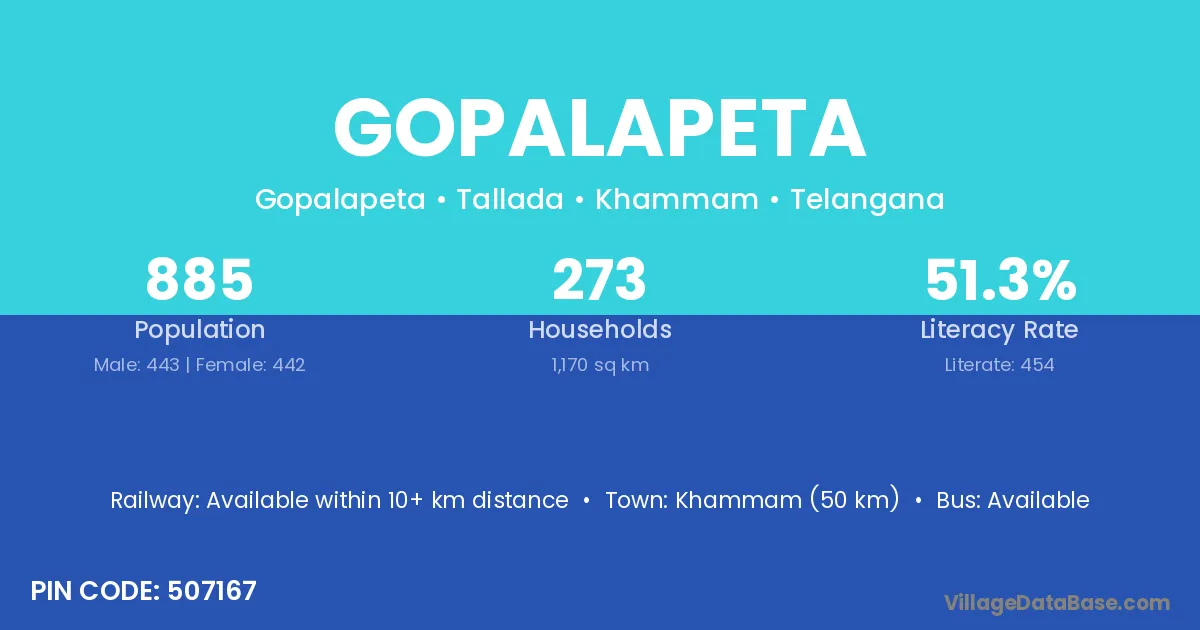 Khammam (50 km) is the nearest town to Gopalapeta village for major economic activities and is located approximately 50 km away.