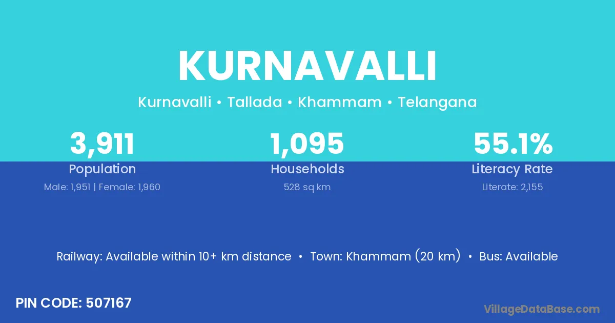 Khammam (20 km) is the nearest town to Kurnavalli village for major economic activities and is located approximately 20 km away.
