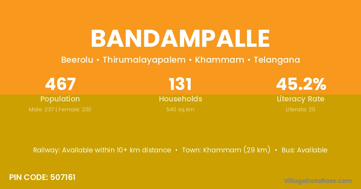 Khammam (29 km) is the nearest town to Bandampalle village for major economic activities and is located approximately 29 km away.