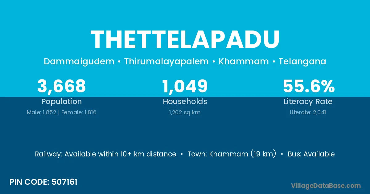 Khammam (19 km) is the nearest town to Thettelapadu village for major economic activities and is located approximately 19 km away.