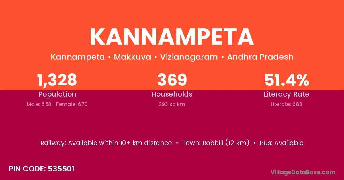 The literacy rate of Kannampeta village is 17.86%. Male literacy stands at 21.43% and female literacy at 14.29%.