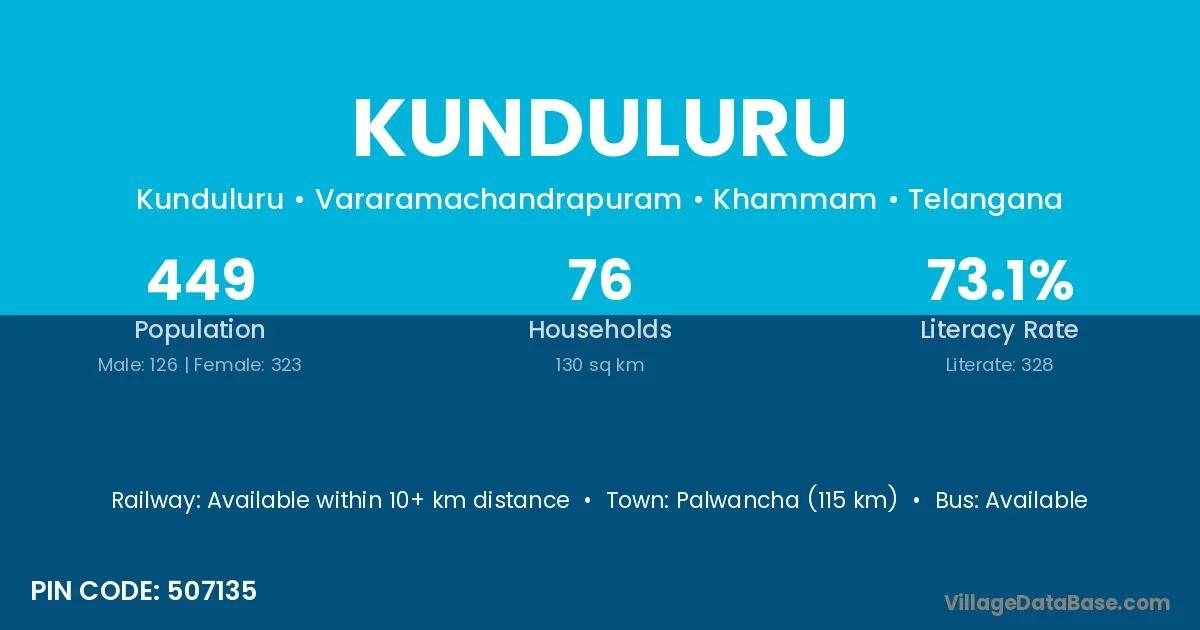 Palwancha (115 km) is the nearest town to Kunduluru village for major economic activities and is located approximately 115 km away.