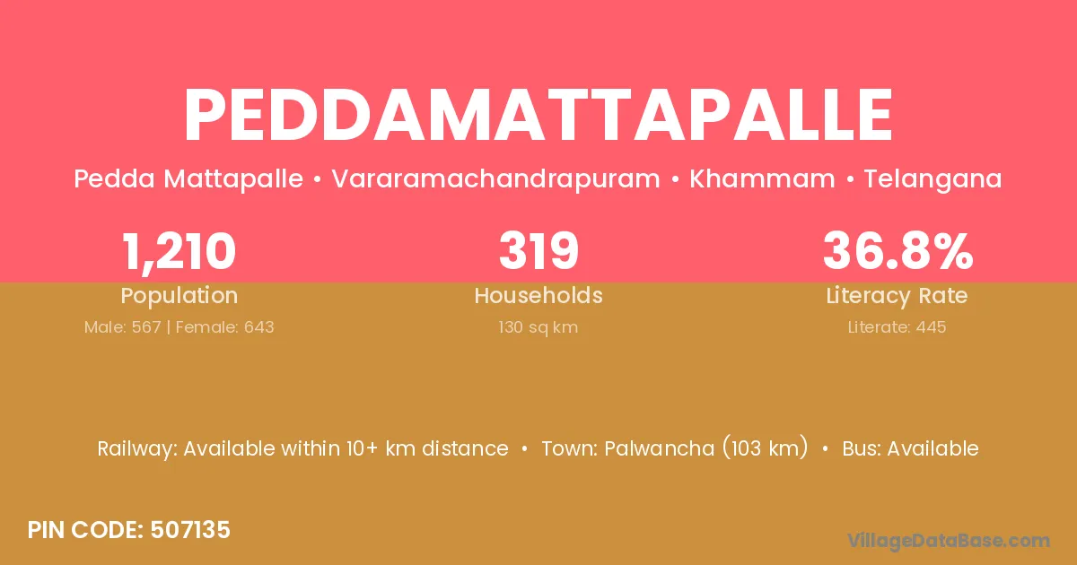 Palwancha (103 km) is the nearest town to Peddamattapalle village for major economic activities and is located approximately 103 km away.
