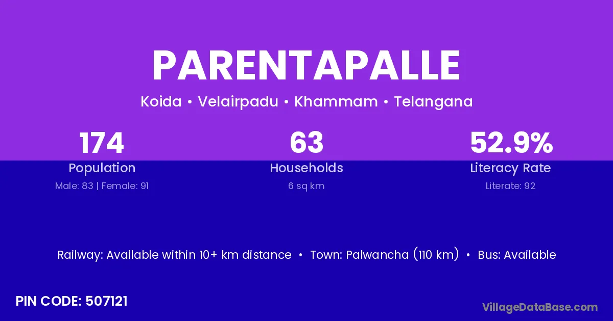 Palwancha (110 km) is the nearest town to Parentapalle village for major economic activities and is located approximately 110 km away.