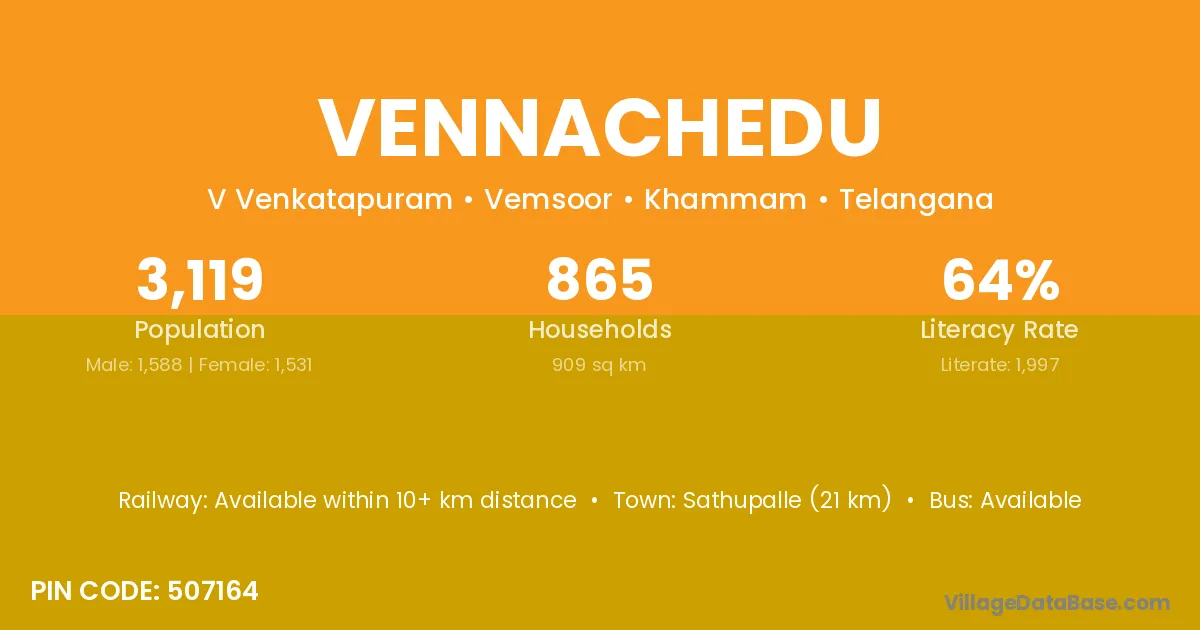 Sathupalle (21 km) is the nearest town to Vennachedu village for major economic activities and is located approximately 21 km away.