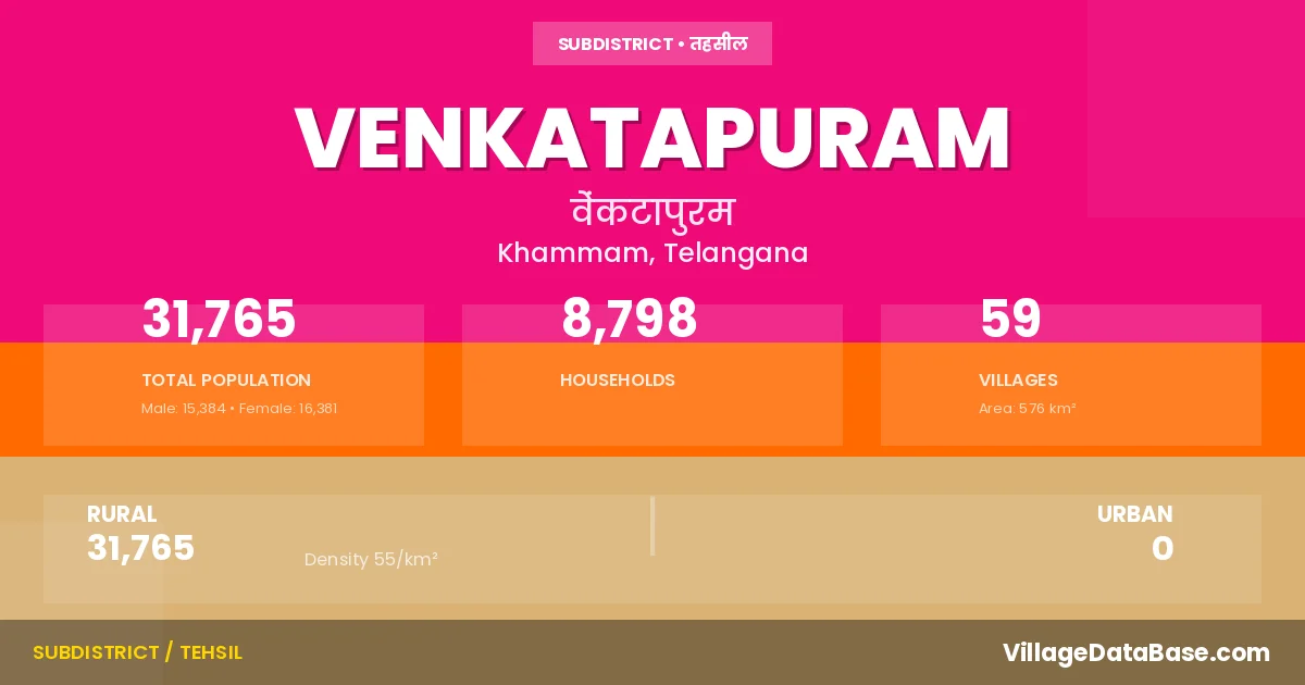 According to the 2011 census The total area of Venkatapuram Mandal is 576 km², with a population of 31765 people. The population density is 55 inhabitants per square kilometre, and there are approximately 8798 houses in the sub district.