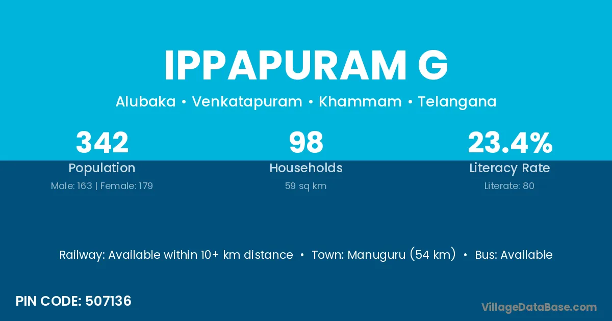 Manuguru (54 km) is the nearest town to Ippapuram G village for major economic activities and is located approximately 54 km away.