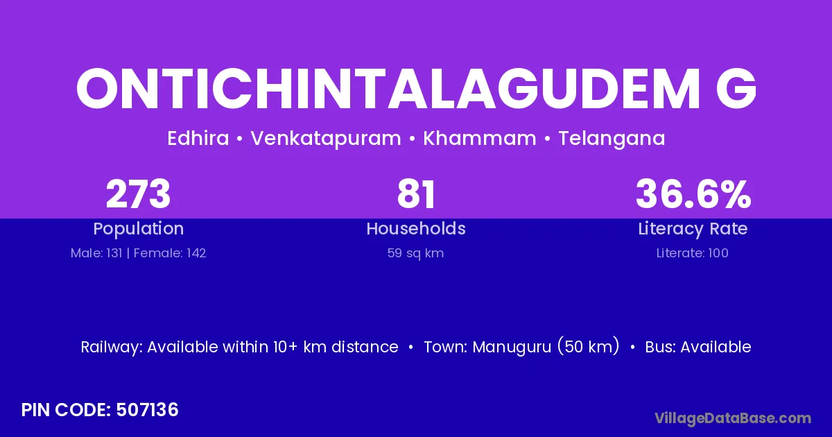 Manuguru (50 km) is the nearest town to Ontichintalagudem G village for major economic activities and is located approximately 50 km away.