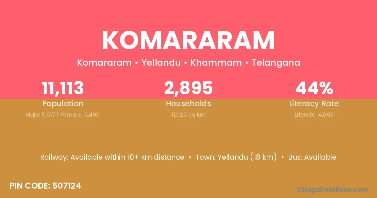 Yellandu (18 km) is the nearest town to Komararam village for major economic activities and is located approximately 18 km away.