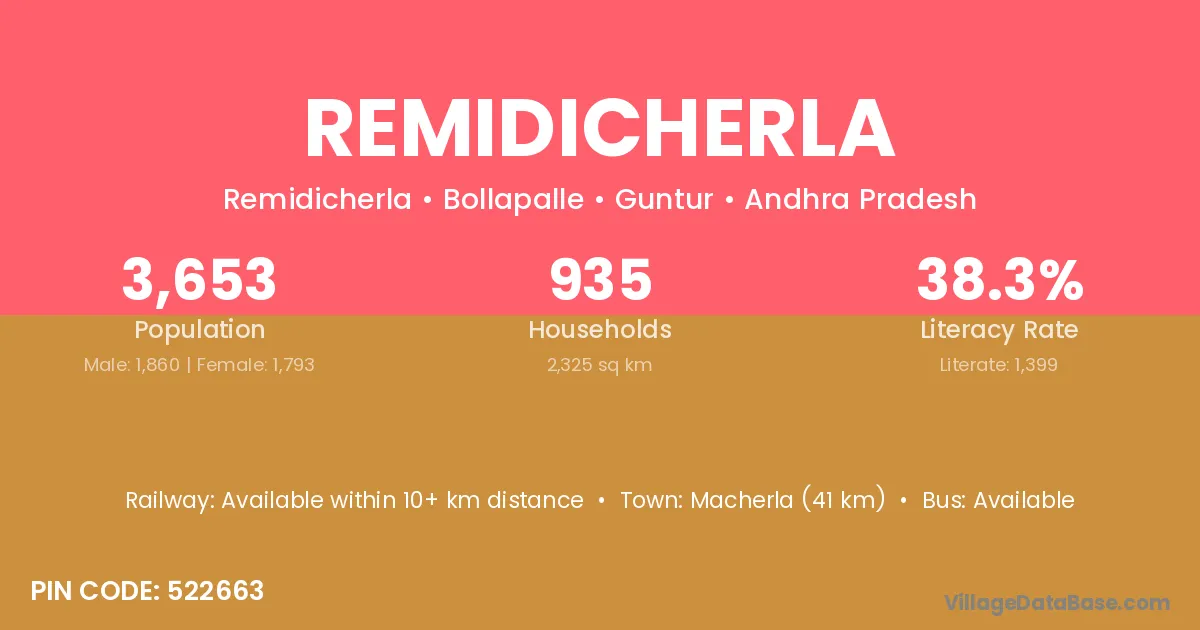 The literacy rate of Remidicherla village is 53.49%. Male literacy stands at 61.33% and female literacy at 45.62%.
