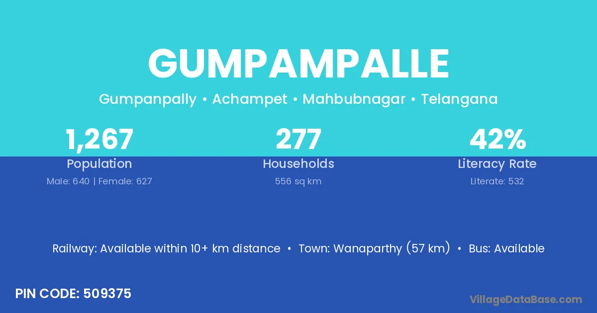 Wanaparthy (57 km) is the nearest town to Gumpampalle village for major economic activities and is located approximately 57 km away.