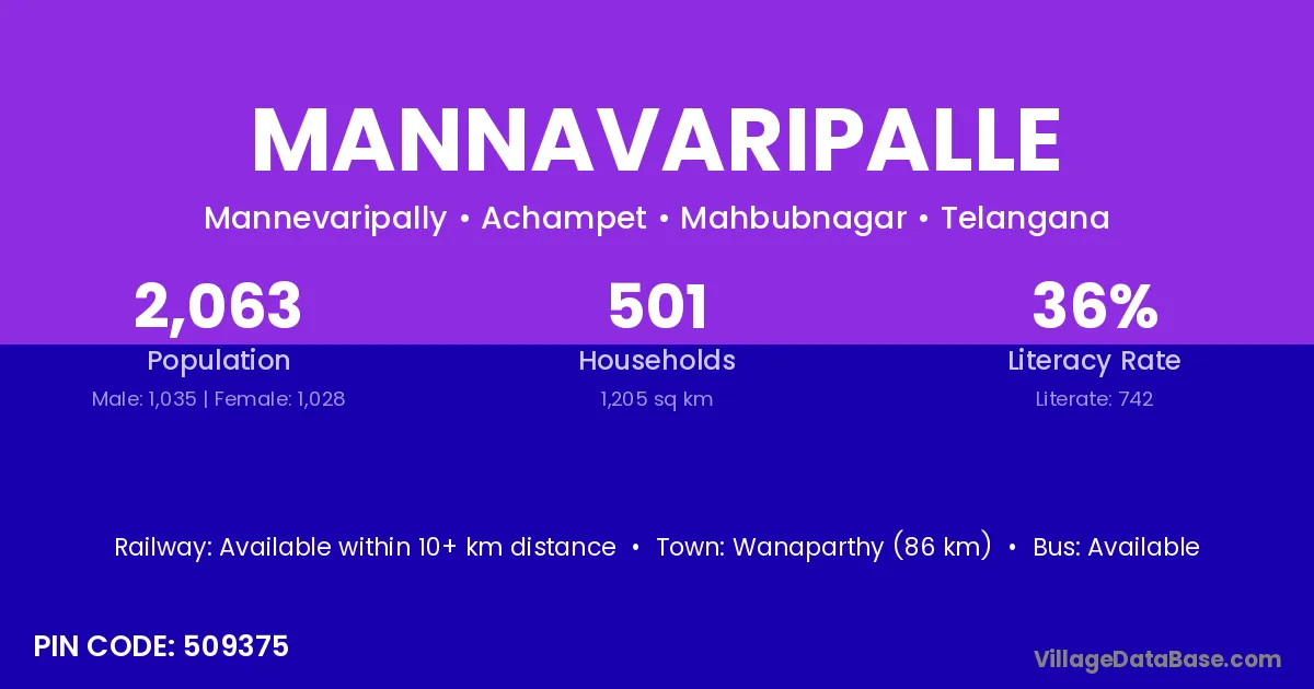 Wanaparthy (86 km) is the nearest town to Mannavaripalle village for major economic activities and is located approximately 86 km away.