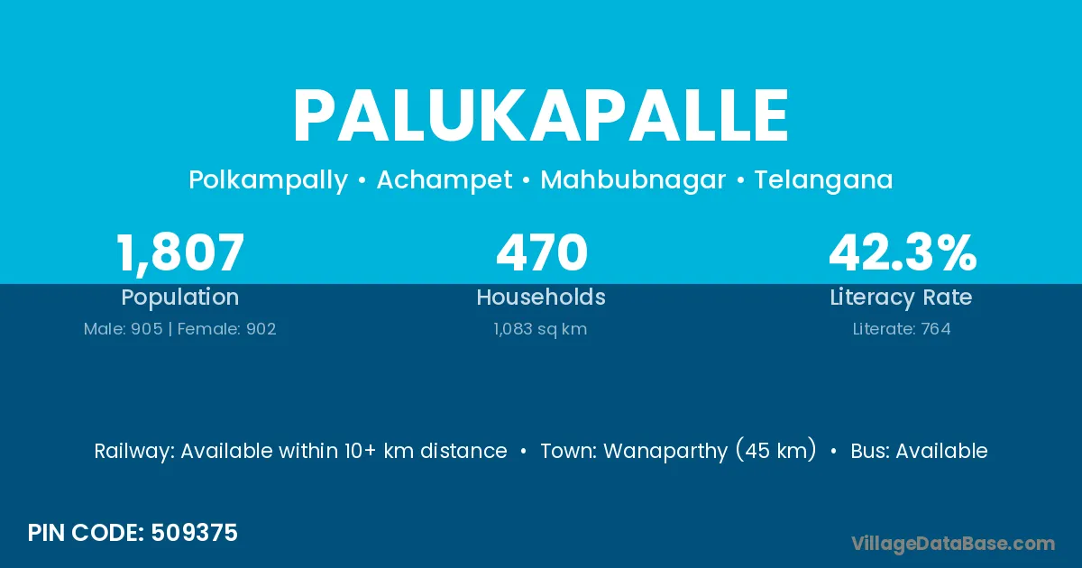 Wanaparthy (45 km) is the nearest town to Palukapalle village for major economic activities and is located approximately 45 km away.