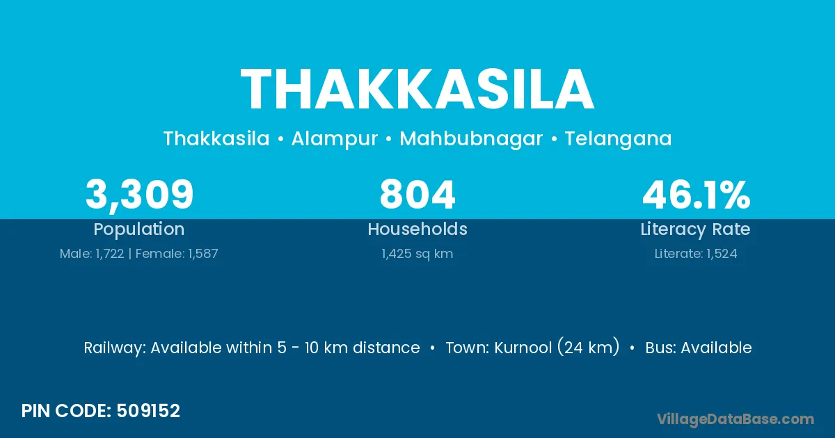 Kurnool (24 km) is the nearest town to Thakkasila village for major economic activities and is located approximately 24 km away.