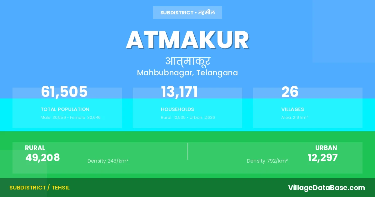 According to the 2011 census The total area of Atmakur Mandal is 218 km², with a population of 61505 people. The population density is 282 inhabitants per square kilometre, and there are approximately 13171 houses in the sub district.