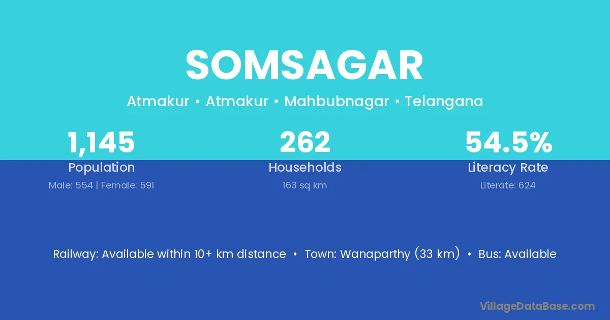 Wanaparthy (33 km) is the nearest town to Somsagar village for major economic activities and is located approximately 33 km away.
