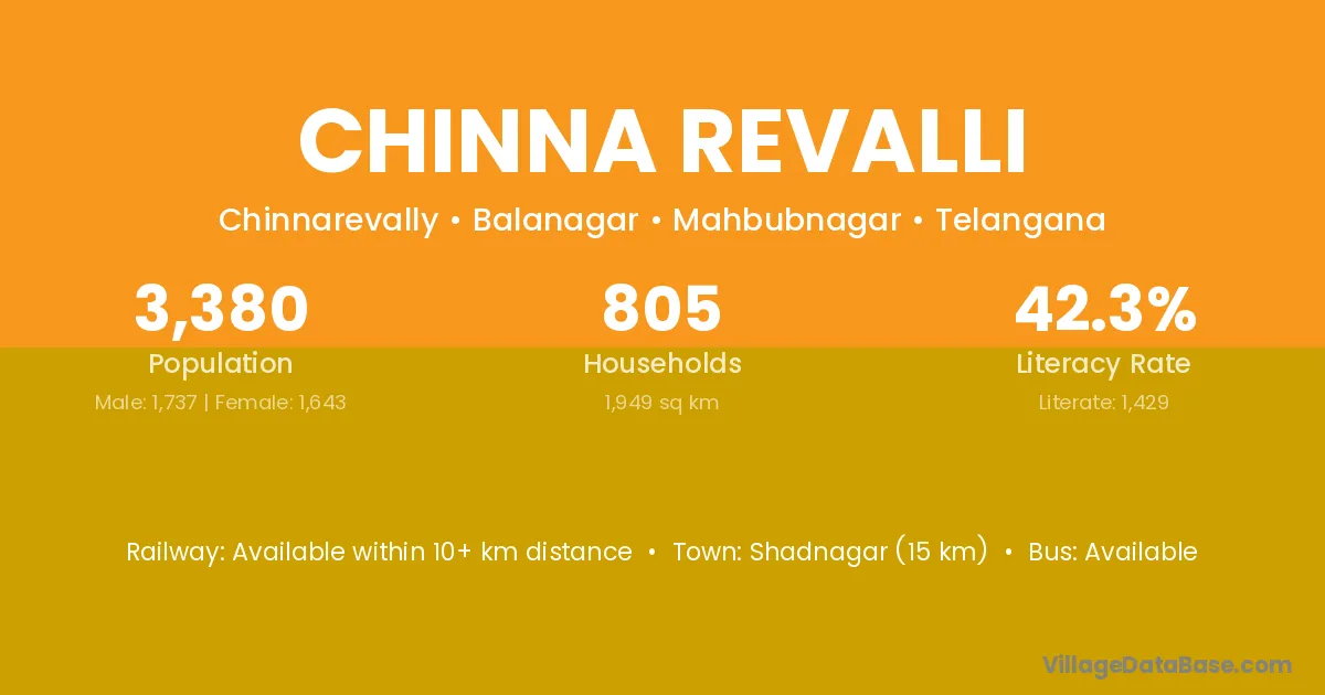 Shadnagar (15 km) is the nearest town to Chinna Revalli village for major economic activities and is located approximately 15 km away.