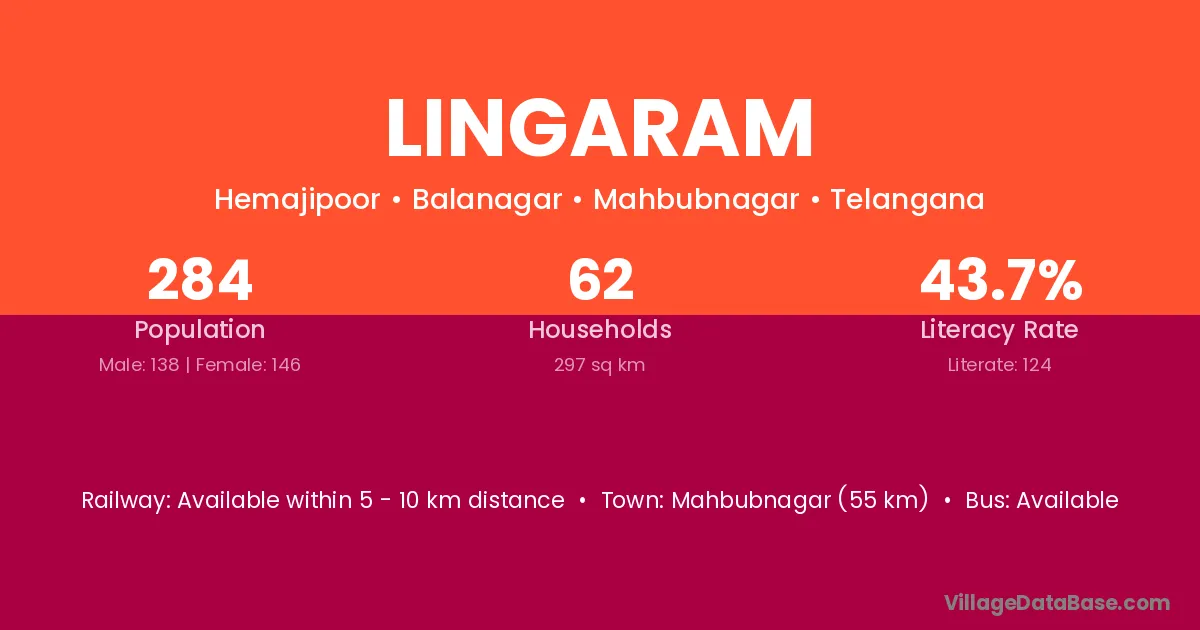 Mahbubnagar (55 km) is the nearest town to Lingaram village for major economic activities and is located approximately 55 km away.
