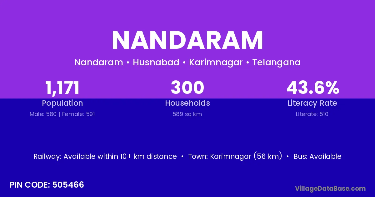 Mahbubnagar (37 km) is the nearest town to Nandaram village for major economic activities and is located approximately 37 km away.