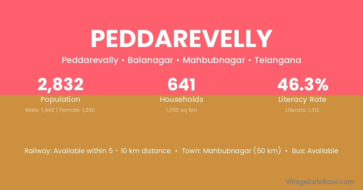 Mahbubnagar (50 km) is the nearest town to Peddarevelly village for major economic activities and is located approximately 50 km away.