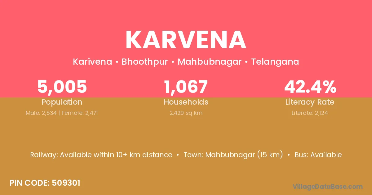 Mahbubnagar (15 km) is the nearest town to Karvena village for major economic activities and is located approximately 15 km away.