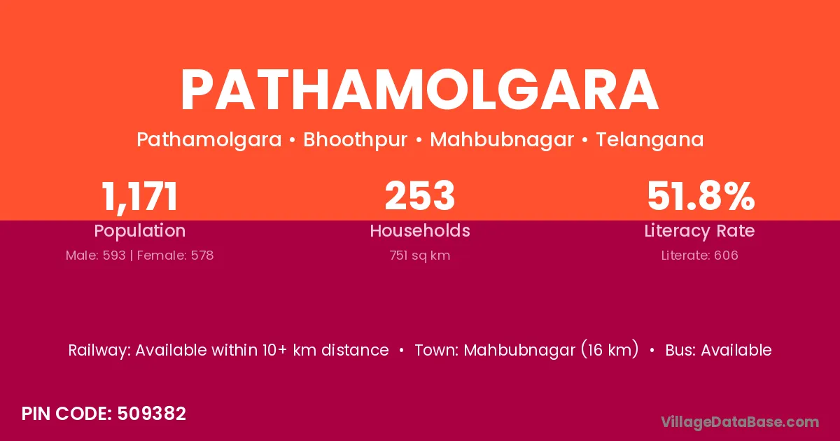 Mahbubnagar (16 km) is the nearest town to Pathamolgara village for major economic activities and is located approximately 16 km away.