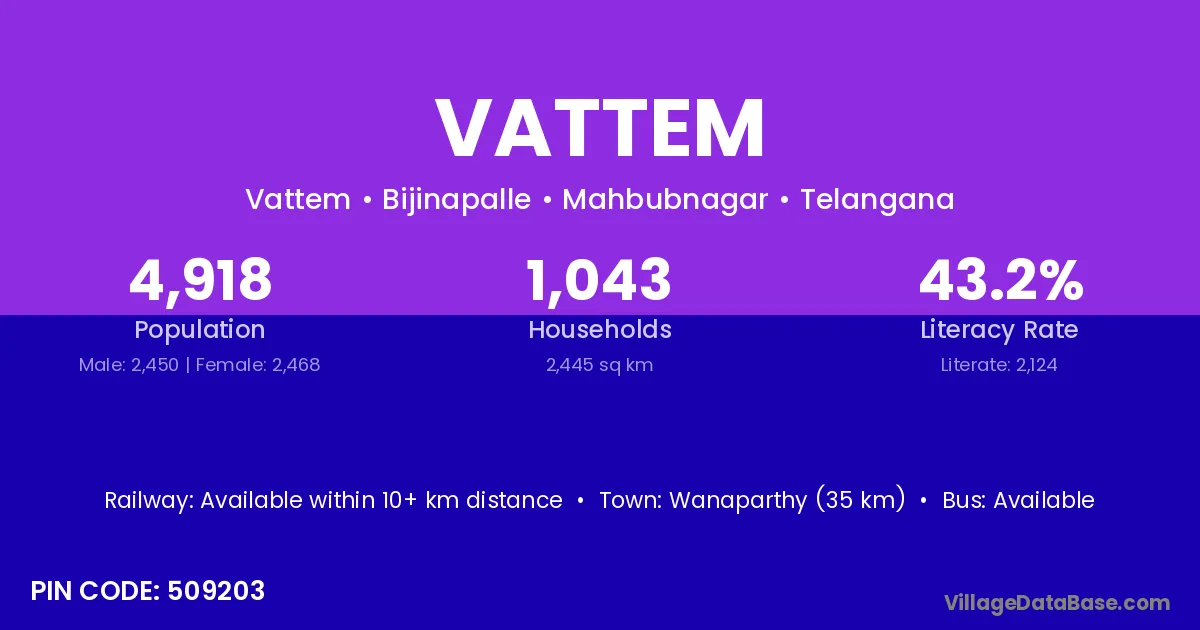 Wanaparthy (35 km) is the nearest town to Vattem village for major economic activities and is located approximately 35 km away.