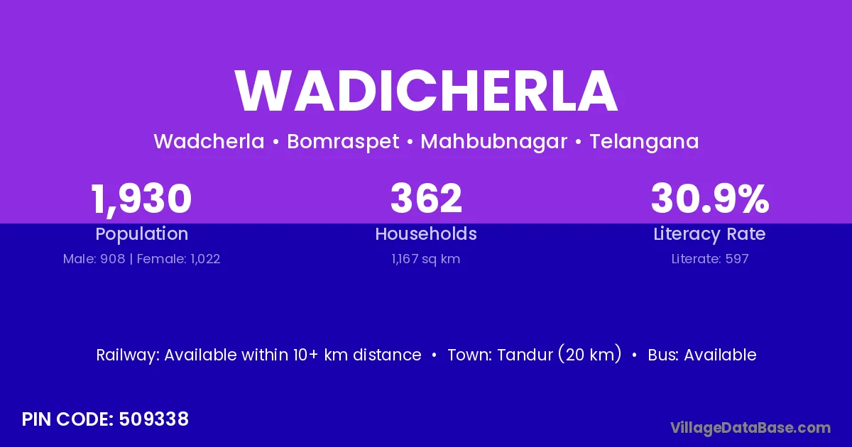 Tandur (20 km) is the nearest town to Wadicherla village for major economic activities and is located approximately 20 km away.