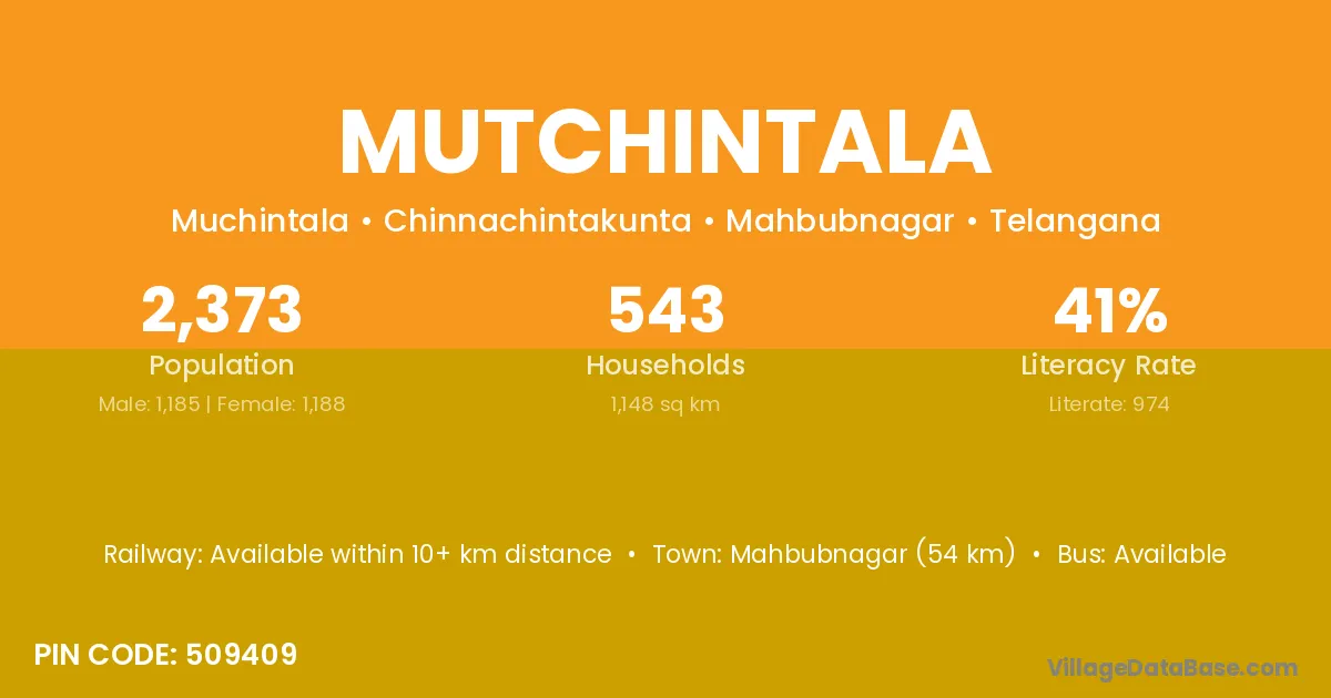 Mahbubnagar (54 km) is the nearest town to Mutchintala village for major economic activities and is located approximately 54 km away.