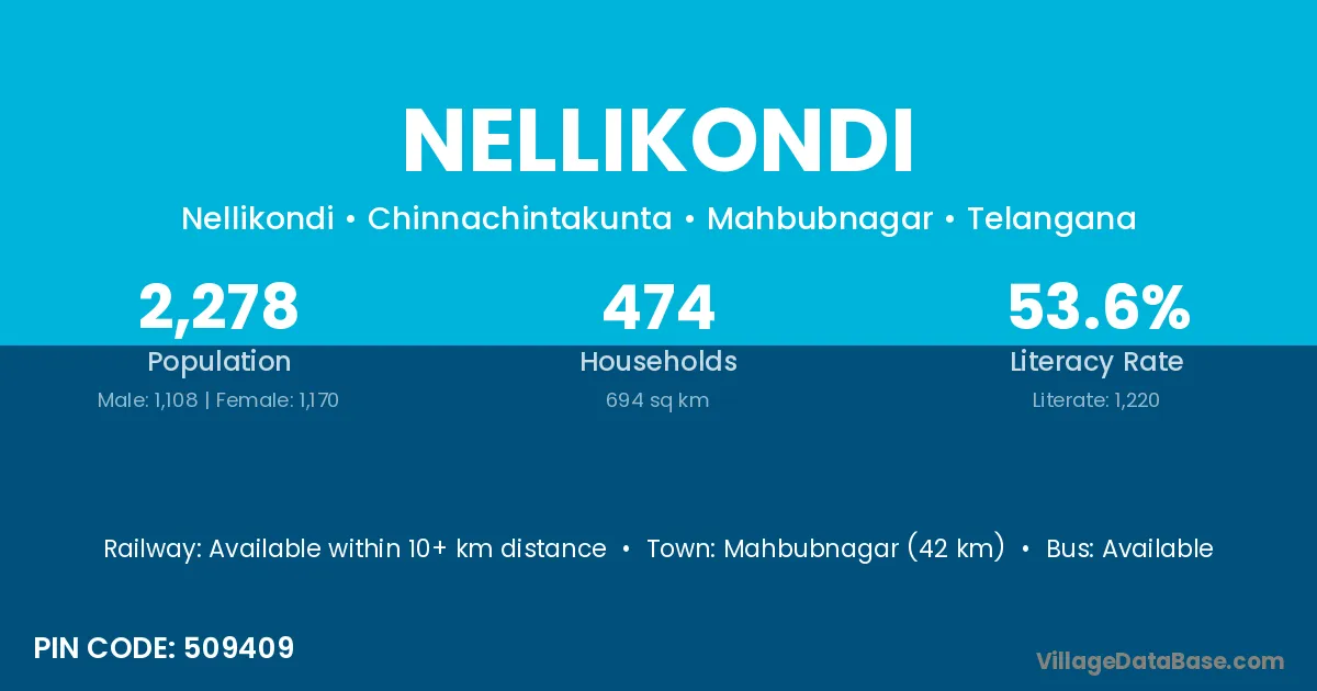 Mahbubnagar (42 km) is the nearest town to Nellikondi village for major economic activities and is located approximately 42 km away.
