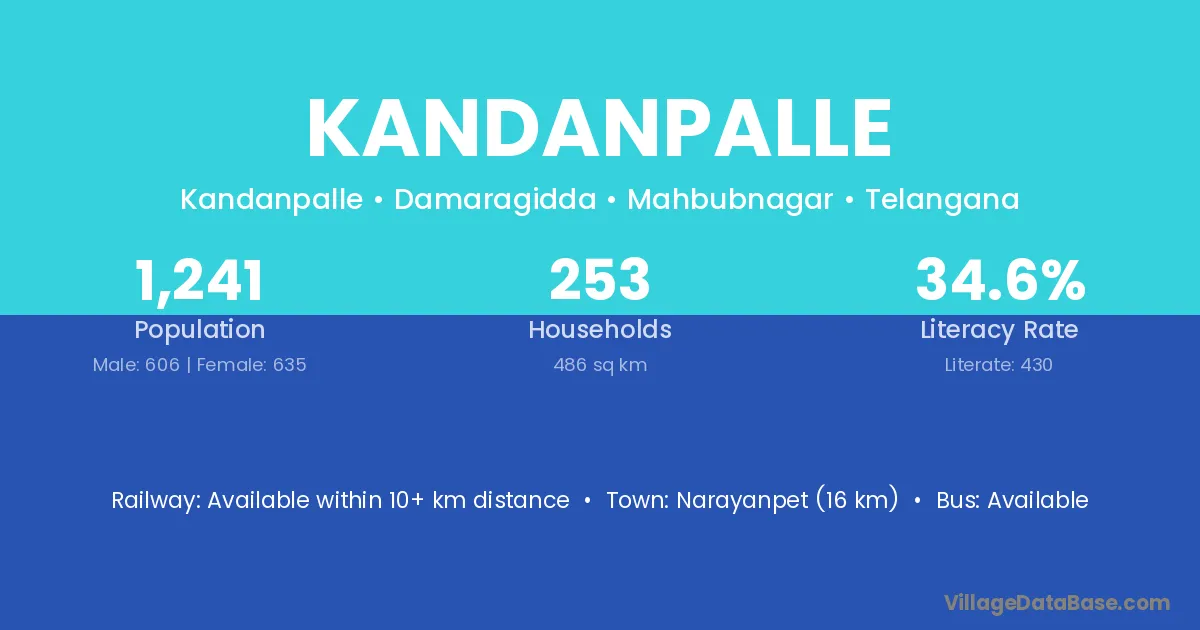 Narayanpet (16 km) is the nearest town to Kandanpalle village for major economic activities and is located approximately 16 km away.