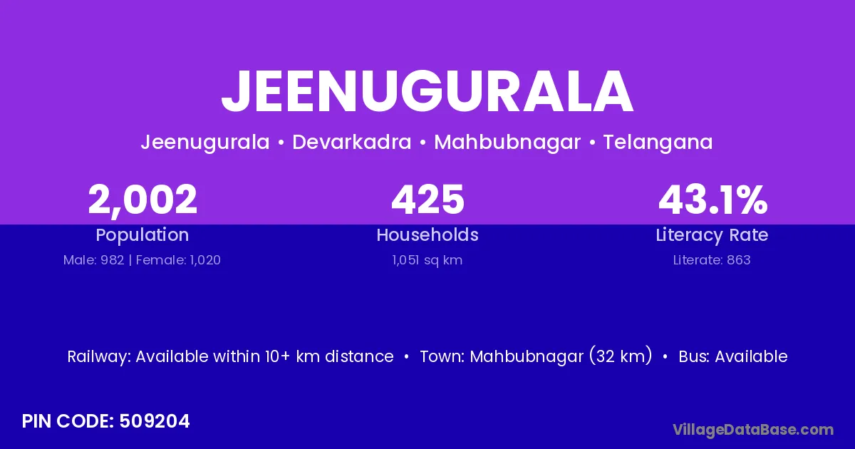 Mahbubnagar (32 km) is the nearest town to Jeenugurala village for major economic activities and is located approximately 32 km away.