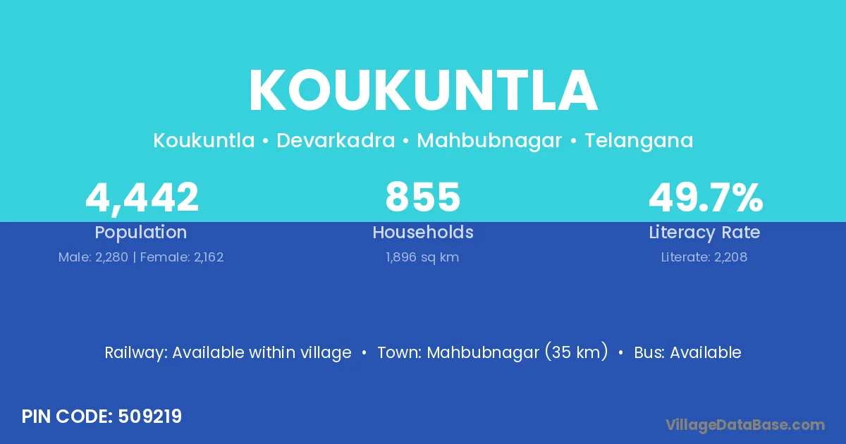 Mahbubnagar (35 km) is the nearest town to Koukuntla village for major economic activities and is located approximately 35 km away.